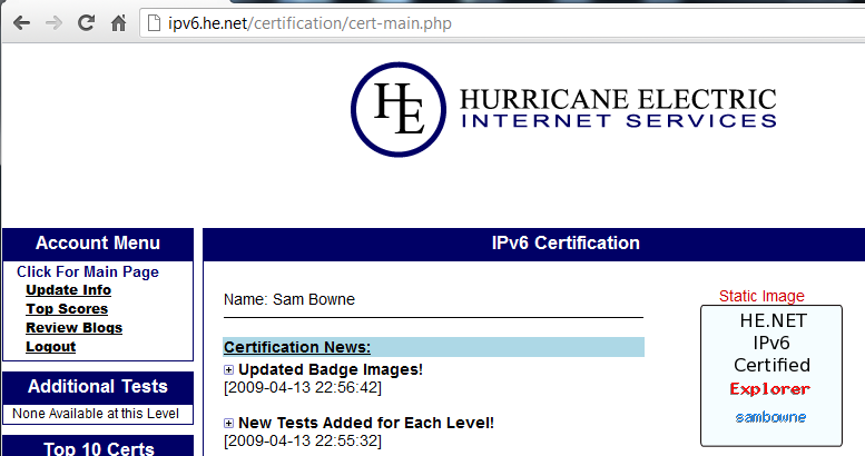 Your badge should now show Explorer, as shown below. Click your badge to see your score: you now have 75 Hurricane Electric points, which are worth 7.5 points in my classes.