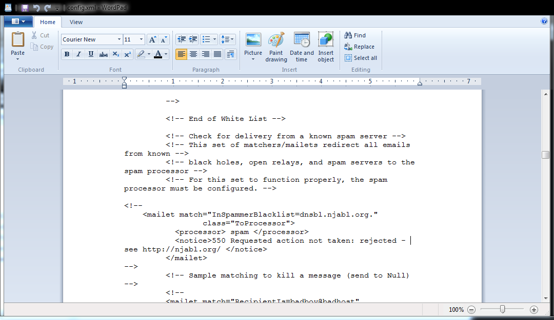 Nagivate to the openlogic-apache-james-2.3.1-all-bin-1\apache-james-2.3.1\apps\james\SAR-INF folder and open the config.xml file in Wordpad.