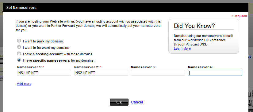 Click Nameservers. On the next page, change the first two nameservers to NS1.HE.NET and NS2.HE.NET, as shown below on this page. Leave the others blank. Click the OK button. A message appears saying "Your changes have been submitted...". Click the OK button.