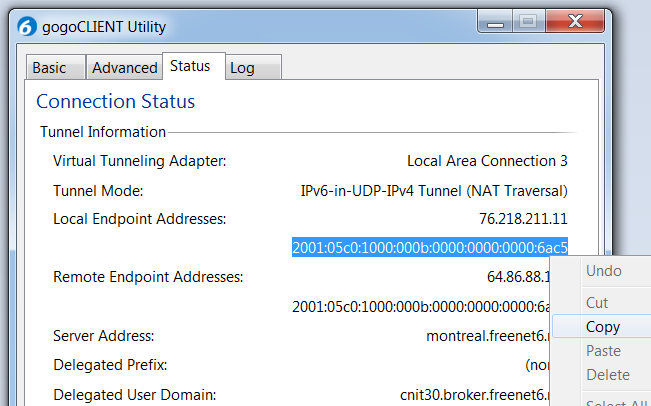 Checking your Reverse DNS ResolutionClick Start, type in gogo, and click "gogoCLIENT Utility". In the gogoCLIENT Utility, click the Status tab. Highlight your "Local Endpoint Address", right-click the highlighted address, and click Copy, as shown below on this page.