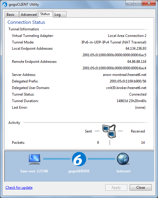 In the gogoCLIENT Utility, click the Basic tab. Click the Disconnect button. Click the Connect button. In the "Save changes before connecting?" box, click Save. In the gogoCLIENT Utility, click the Status tab. You should see your "Delegated Prefix", as shown below on this page.