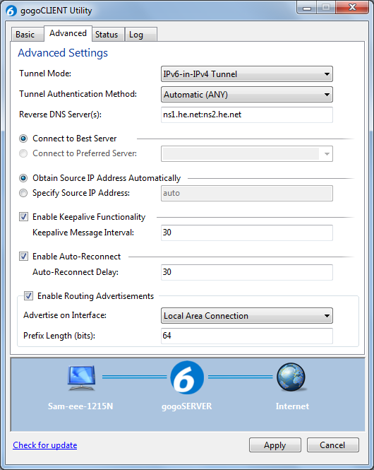 Routing AdvertisementsIn the gogoCLIENT Utility, click the Advanced tab. At the bottom, check the "Enable Routing Advertisements" box. In the "Advertise on Interface" drop-down box, select "Local Area Connection" or whatever interface you are using to connect to the Internet.This setting tells Freenet6 that you are not just a single computer, but a router for a network. So Freenet gives you a dedicated IPv6 prefix. This is a real, publicly routed Internet address block, with an incredible number of addresses for you to use--each person who requests it gets more addresses than the entire IPv4 address space for their own use.