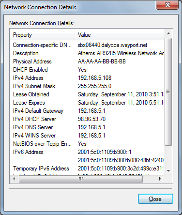 Finding Your New IPv6 AddressOn your Windows desktop, click Start. In the Search box, type NETWORK CONNECTIONS and click "View Network Connections" in the results section. Double-click "Local Area Connection". In the "Local Area Connection Status" box, click the Details button. You should see your IPv6 address, which is your assigned prefix followed by ::1, as shown below on this page.