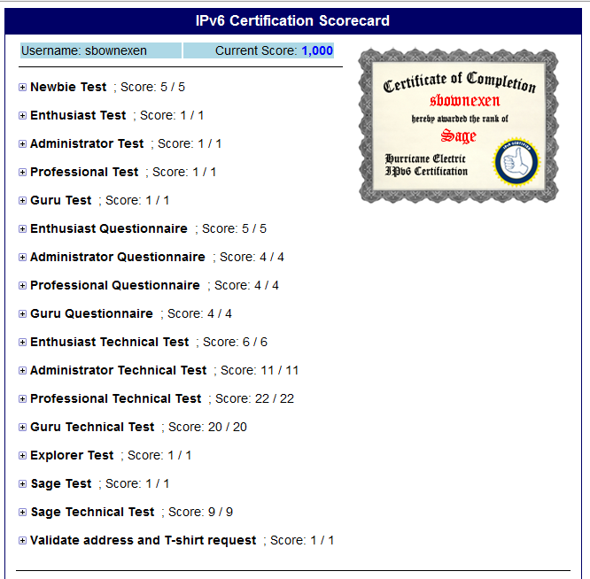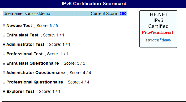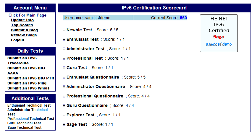 Calculating Your PointsTo determine your CCSF points, divide the Hurricane Electric points by 10. If you have 560 points, as shown above on this page, you can get 56 points.However, you can get a lot more points by taking the "Additional Tests" shown on the left side. If you take them all, you can get up to 1000 Hurricane Electric points, as shown above on this page, which is worth 100 CCSF points. You can also get the IPv6 Guru T-Shirt by filling out the request form at Hurricane Electric.