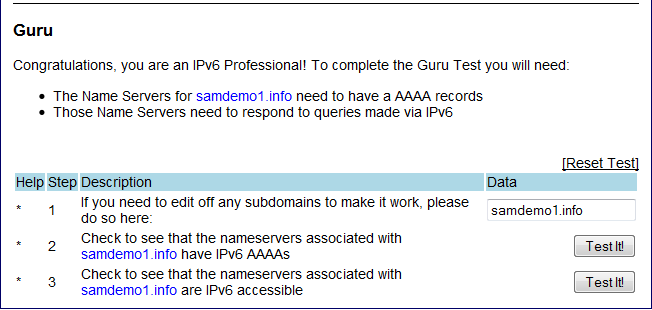 Passing the Guru TestThe Hurricane Electric Certification test now shows the Guru test, as shown below on this page. These tests determine if your namesevers are properly using IPv6, which they obviously are, since you are using the Hurricane Electric nameservers. Just click the two "Test It!" buttons. Then complete the questionnaire and you are a Guru.