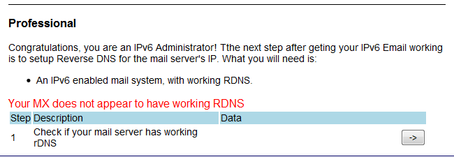 Testing Your Reverse DNS Configuration at Hurricane ElectricIn Firefox, go to http://ipv6.he.net/certification/ and log in. In the Professional section, in the "Check if your mail server has working rDNS" line, click the -> button. If you get a red "Your MX does not appear to have working RDNS" message, as shown bwlow on this page, it probably means that your DNS records have not yet propagated to the DNS server used by the test. You may have to wait a few hours. You can test your DNS to see when it updates, as explained below.