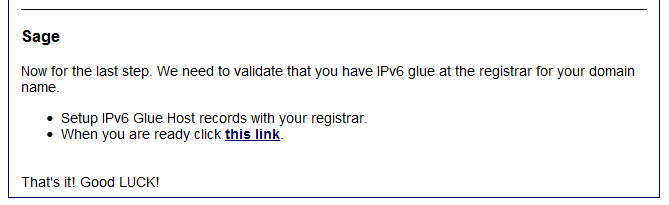 Passing the Sage TestThe Hurricane Electric Certification test now shows the Sage test, as shown below on this page. This determines if your domain name registrar put an IPv6 glue record on the root domain servers. GoDaddy does that for you. Just click the two "this link" link. On the next page, click the Submit button. On the next page, scroll to the bottom and click the Submit button. A message says "Nothing to do here."
