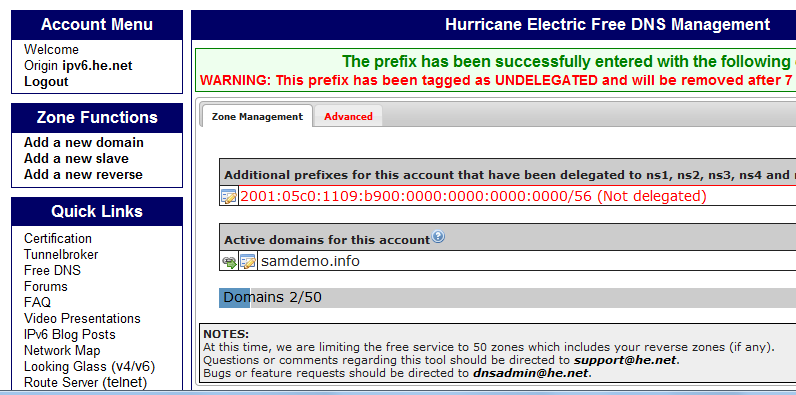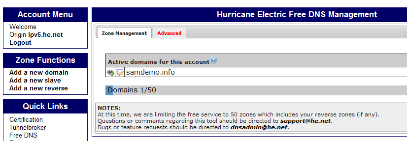Configuring a DNS Zone at Hurricane ElectricIn Firefox, go to dns.he.netOn the upper left, log in with the account you are using for the IPv6 Certification tests. On the left, click "Add a new domain" In the "Domain Name" box, type your domain name. Click the "Add Domain! button. Your domain appears in the "Active domains for this account" list, as shown below on this page.