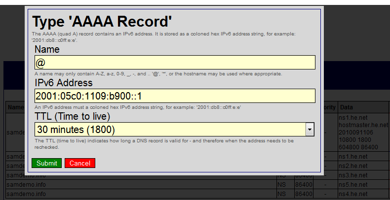 Click the "New AAAA" tab. In the box that appears, enter a Name of @ and an "IPv6 Address" of your interface's IPv6 address. Set the TTL to 30 minutes, as shown below on this page. Click the Submit button.