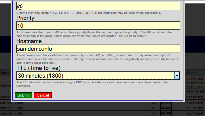 Click the "New MX" tab. In the box that appears, in the top field, enter @ In the "Priority" field, enter 10 In the "Hostname" field, enter your domain name. Set the TTL to 30 minutes, as shown below on this page. Click the Submit button.