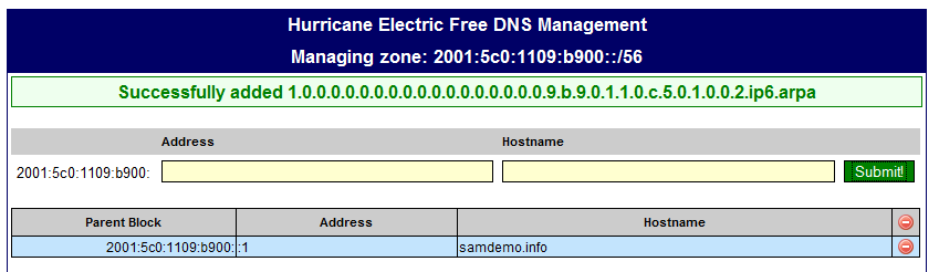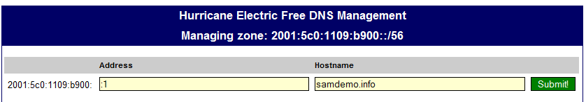 Click the little pencil-and-paper icon just to the left of your prefix. A page opens with a chart titled "Hurricane Electric Free DNS Management Managing zone:", as shown below on this page. Enter a "Host Address" of :1 Type your domain name into the "Hostname" field. Click the Submit! button.