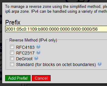 Configuring a Reverse DNS Zone at Hurricane ElectricOn the left side of the "Hurricane Electric Free DNS Management" page, click "Return to main".On the left, click "Add a new reverse" In the "Prefix" box, type your IPv6 Prefix. You will have to add :0000:0000:0000:0000 to the end of your prefix, as shown below on this page. Click the "Add Prefix! button.