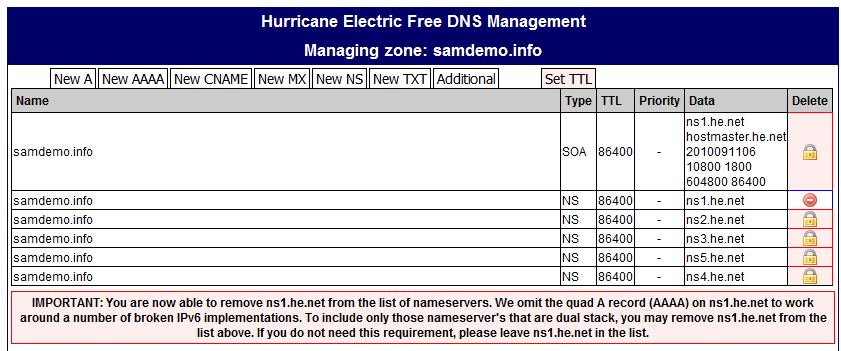 Now you need to add some records to your zone. Click the little pencil-and-paper icon just to the left of your domain name. A page opens with a chart titled "Hurricane Electric Free DNS Management Managing zone:", as shown below on this page.