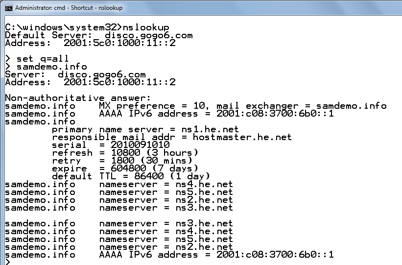 Testing Reverse DNS RecordsIn a Command Prompt window. if nslookup is still running, type EXIT and press the Enter key to stop it.Type in these commands: