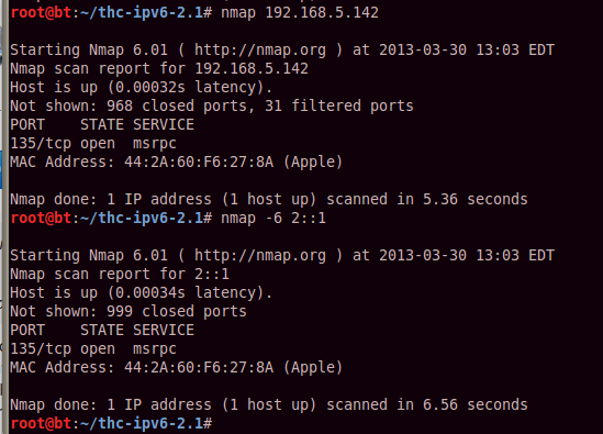 I scanned it from a Backtrack virtual machine. It really is listening on both IPv4 and IPv6. How rude!