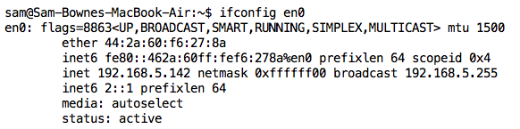 To test this, I use the en0 adapter on my Mac, which has an IPv4 address of 192.168.5.142 and an IPv6 address of 2::1.