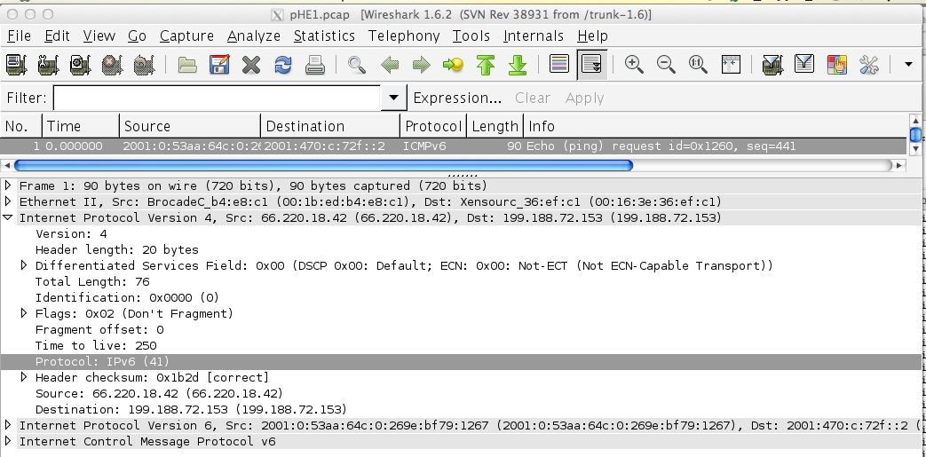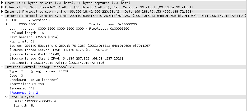 The IPv6 packet shows that I sent this ping from a machine using Teredo, which is correct--I used a Mac connected with the Miredo client.