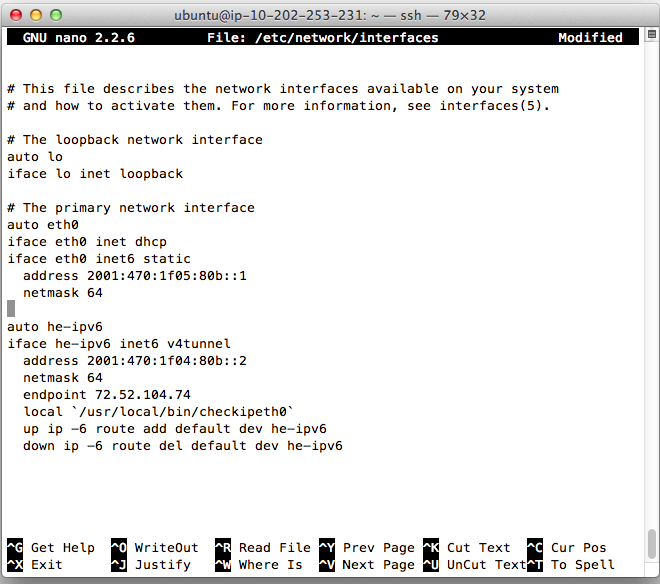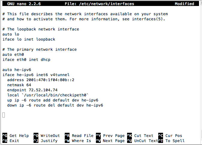 Move the cursor to the bottom of the file and paste in the code below, replacing the $CLIENT_IPV6 and $SERVER_IPV4 placeholders with the actual values for your Hurricane Electric tunnel (omitting the /64 from the $CLIENT_IPV6):