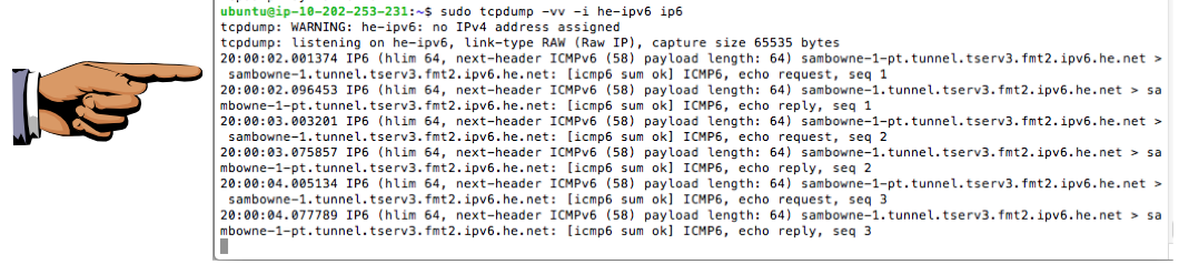 sudo tcpdump -vv -i he-ipv6 ip6Now wait two minutes. You should see three "echo request" packets and three "echo reply" packets, as shown below: