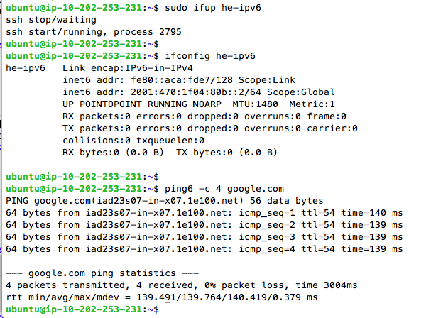 sudo ifup he-ipv6 ifconfig he-ipv6 ping6 -c 4 google.com