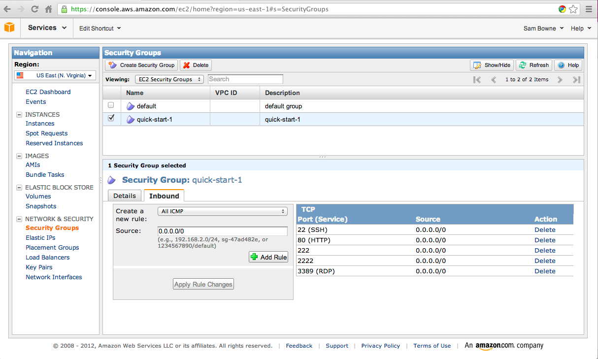 In the lower pane, note the Security Group (mine was quick-start-1).