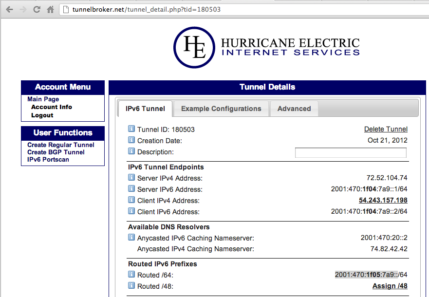 In the "Tunnel Details", find your "Routed /64". Mine is 2001:470:1f05:7a9::/64, as shown below: