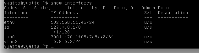 set interfaces tunnel tun0 address 2001:470:1f05:7a9::2/64
