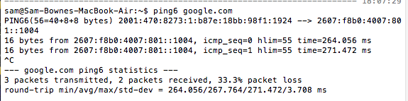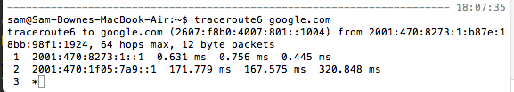 traceroute6 google.comFor some reason, the Mac doesn't show any additional hops. :