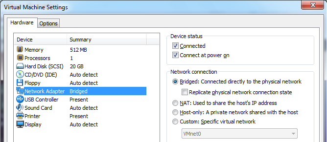 From the VMware menu bar, click VMware, Settings. Set the Network adapter to "Bridged" mode, as shown below on this page.
