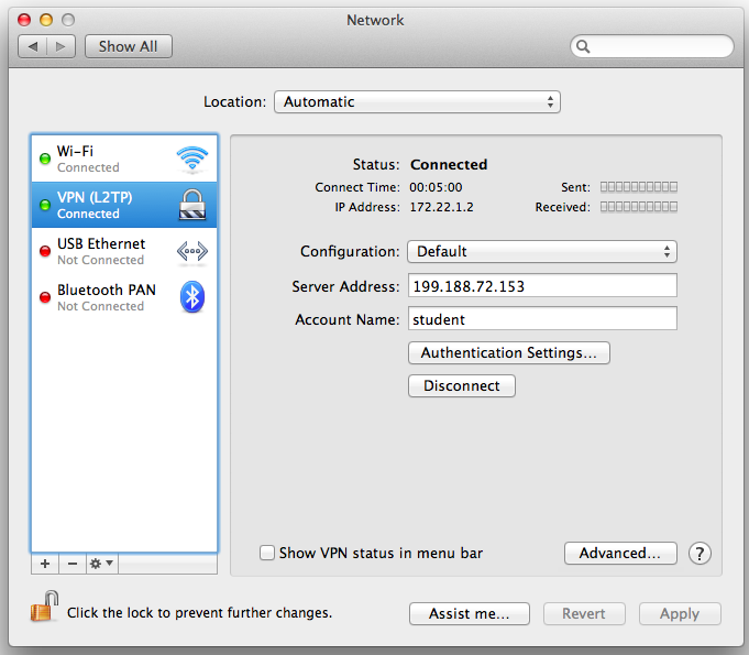 Your VPN connection should appear on the left with a green dot, and a status of "Connected", as shown below: