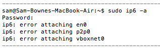 To enable IPv6 on all interfaces, on your Mac, in a Terminal window, execute this command: