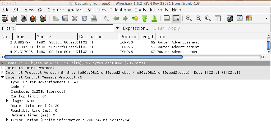 Within ten seconds, you should see an Router Advertisement, with the correct Prefix Information, as shown below:
