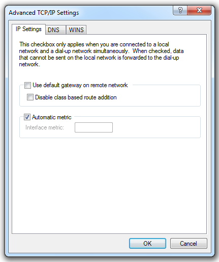 In the "Advanced TCP/IP Settings" box, clear the "Use default gateway on remote network" check box, as shown below: