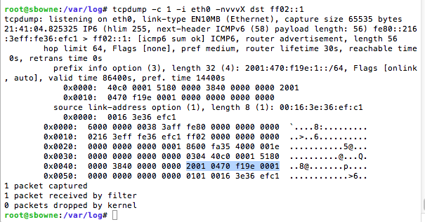tcpdump -c 1 -i eth0 -nvvvX dst ff02::1