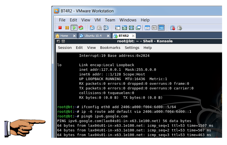 In the BackTrack VM, in the Terminal Window, execute these commands to assign an IP address to the eth0 interface and a default route (replacing the address prefixes with your own delegated prefix):