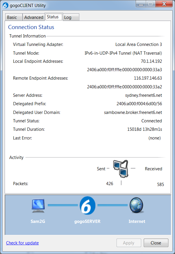 On the Windows 7 host computer, in the gogoCLIENT Utility, on the Status tab, find your Delegated Prefix. Mine is 2406:a000:f004:6d00/56, as shown below: