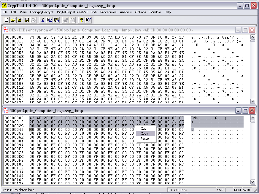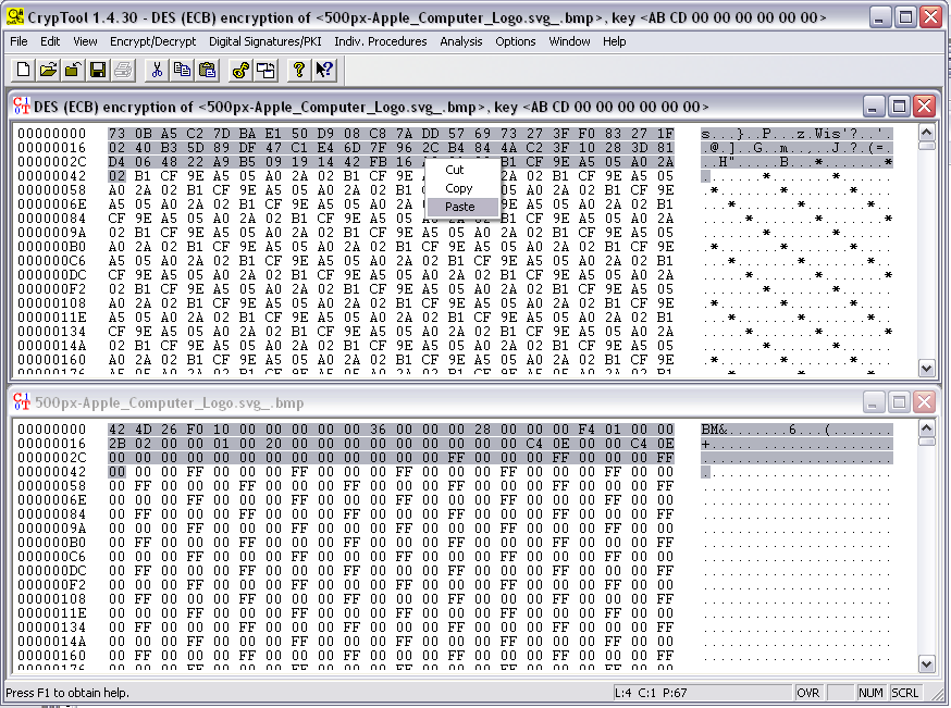 The file is encrypted now. Click Windows, Tile. The image below shows the original file on the bottom, and the encrypted version on the top.