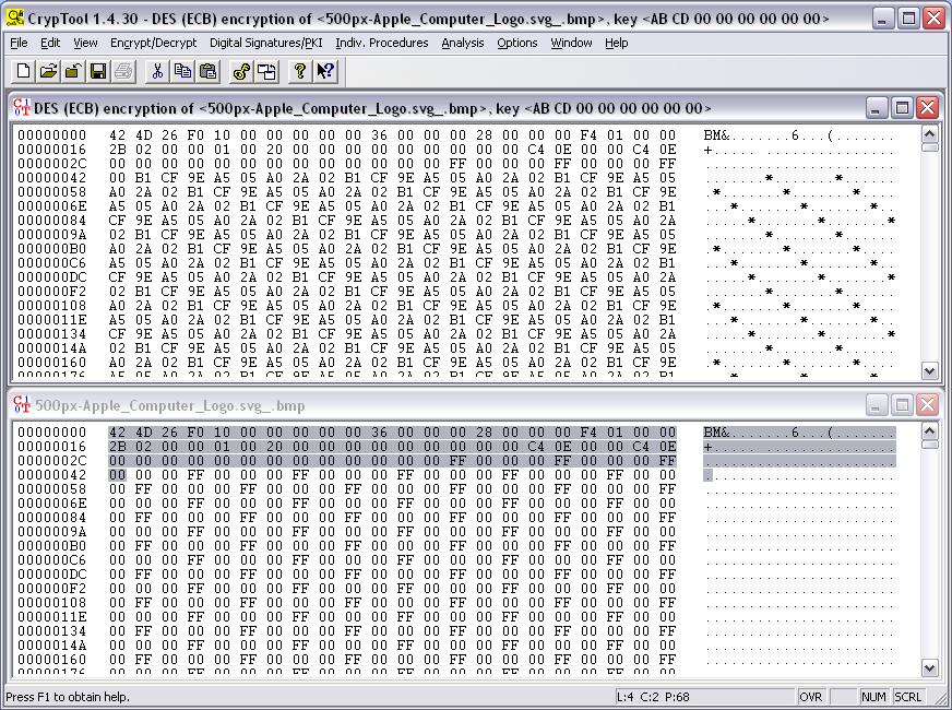 The upper file is encrypted. Notice that the BMP header is also encrypted, so this file won't open in an image viewer anymore.