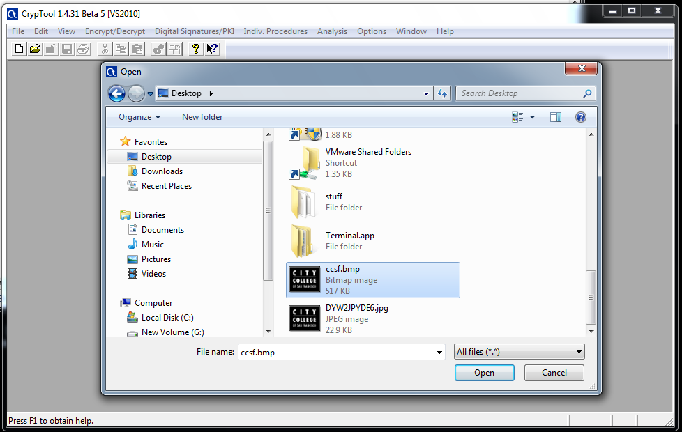 In CrypTools, click File, Open. In the lower right of the "Open" box, select "All files (*.*)", as shown below on this page. Open the BMP image.