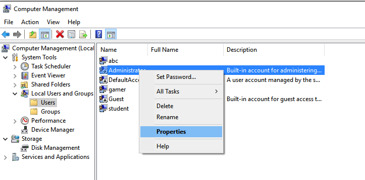 In the right pane, right-click Administrator and click Properties, as shown below.