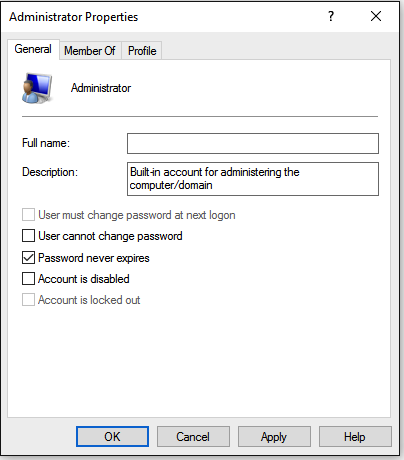 In Administrator Properties, clear the "Account is disabled" check box, as shown below. Click OK.